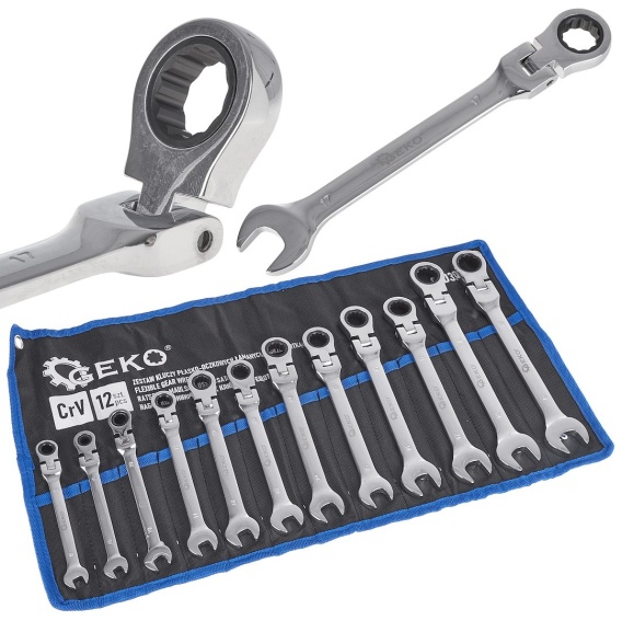 Komplet kluczy płasko-oczkowych GEKO z grzechotką łamanych 12 el. 8-19mm